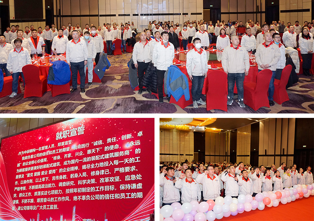年會(huì)在雄壯的國歌聲中拉開序幕,與會(huì)全體人員起立,高唱國歌。緊接著,中辰鋼構(gòu)黨委書記、董事長宋彪帶領(lǐng)30余名中高層管理人員舉起右手,莊嚴(yán)宣誓:“我將踐行‘誠信、責(zé)任、創(chuàng)新、卓越’的企業(yè)核心價(jià)值觀……”,鏗鏘有力的誓言響徹整個(gè)會(huì)場,激勵(lì)自己、感染在場每一名員工。