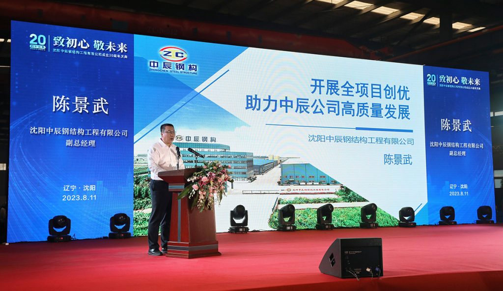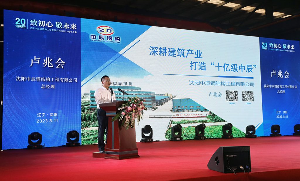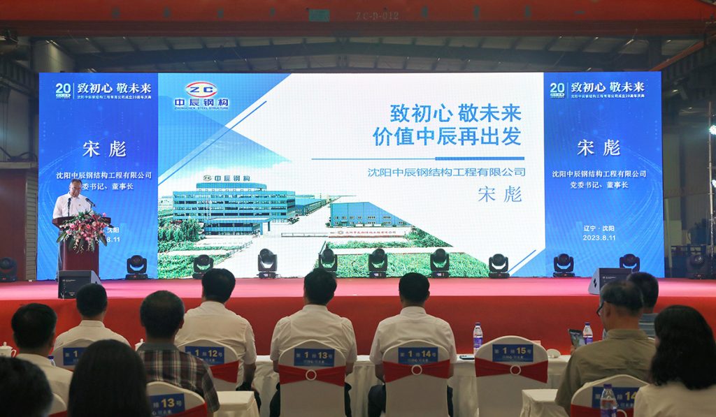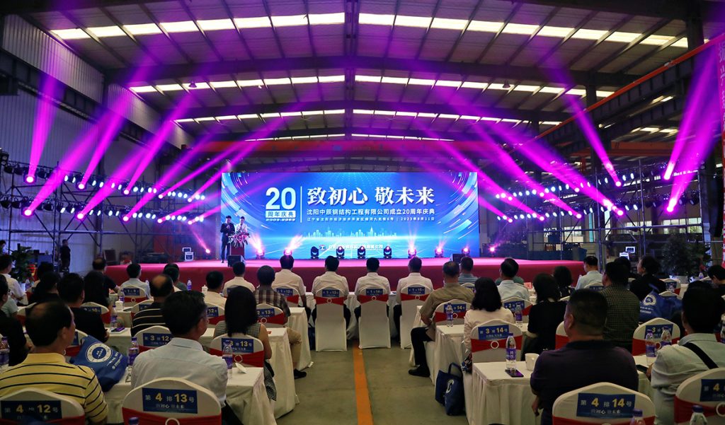 2023年8月11日,中辰鋼構“致初心 敬未來”成立二十周年慶典活動在中辰鋼構2號廠房隆重召開。遼寧省人大環(huán)境資源城鄉(xiāng)建設委員會副主任委員董峰、沈陽市鐵西區(qū)委副書記,區(qū)政府黨組書記、區(qū)長,經開區(qū)、中德園黨工委副書記、管委會主任趙永圣等省市領導出席會議和表彰,300余名合作伙伴與300余名中辰員工共同慶賀中辰鋼構成立二十周年。